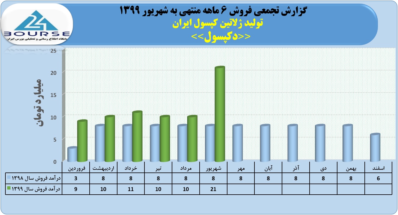 به گزارش کدال نگر بورس ٢۴، شرکت تولید ژلاتین کپسول ایران در ۶ماهه منتهی به شهریور ١٣٩٩ حدود ٧١ میلیارد تومان از فروش محصولات خود درآمد کسب نمود، که ٢١ میلیارد تومان از این مبلغ در شهریور تحقق یافته است.