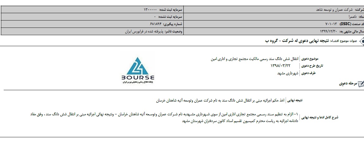 به گزارش کدال نگر بورس ٢۴، شرکت عمران و توسعه شاهد در خصوص نتیجه دادگاه دعوی با شهرداری مشهد اعلام نمود الزام به تنظیم سند رسمی مجتمع تجاری اداری امین از سوی شهرداری مشهدبه نام شرکت عمران وتوسعه آتیه شاهدان خراسان ونتیجه نهائی اجرائیه مبنی بر انتقال شش دانگ سند ، وفق مفاد دادنامه اجرائیه به ریاست محترم کمیسیون تقسیم اسناد کانون سردفتران شهرستان مشهد.