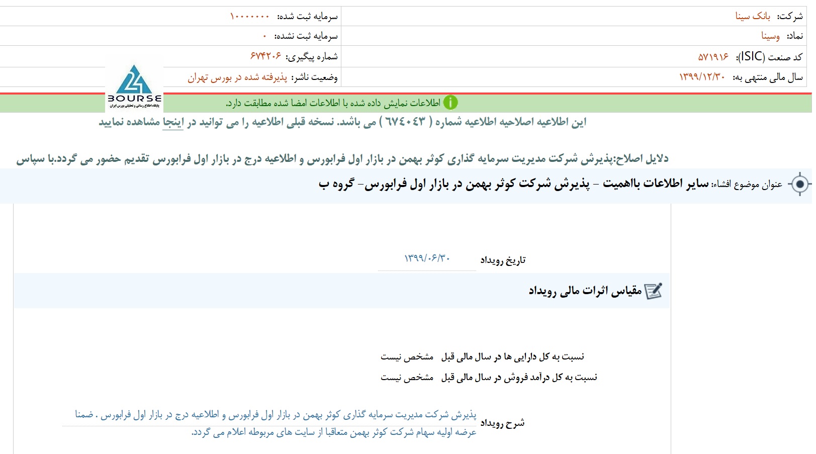 کوثر بهمن در بازار اول فرابورس پذیرش شده و در لیست عرضه های اولیه قرار داشته و بانک سینا قرار است 20 درصد سهام این سرمایه گذاری را به فروش برساند.