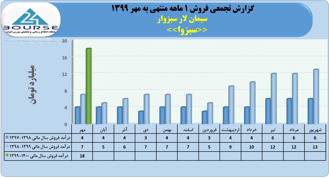 به گزارش کدال نگر بورس ٢۴، شرکت سیمان لار سبزوار در ١ ماهه منتهی به مهر ١٣٩٩ حدود ١٨ میلیارد تومان از فروش محصولات خود درآمد کسب نمود.