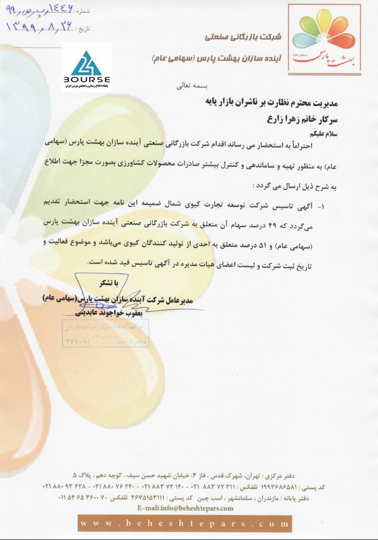به گزارش کدال نگر بورس ٢۴، شرکت بازرگانی صنعتی آینده سازان بهشت پارس از تاسیس شرکت توسعه تجارت کیوی شمال خبر داد که ۴٩ درصد آن متعلق به این شرکت میب اشد.