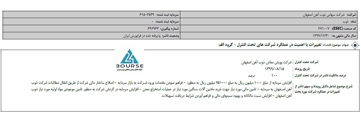 به گزارش کدال نگر بورس ٢۴، شرکت ذوب اهن اصفهان از افزایش سرمایه از مبلغ ١٠٠٠ میلیون ریال به مبلغ ٧۵١٠٠٠ میلیون ریال در شرکت شرکت پویش معادن ذوب آهن اصفهان خبر داد.