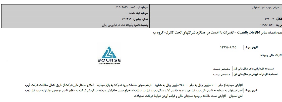 به گزارش کدال نگر بورس ٢۴، شرکت ذوب اهن اصفهان گروه اطلاعیه افزایش سرمایه در شرکت زیر مجموعه را به گروه ب تغییر داد.