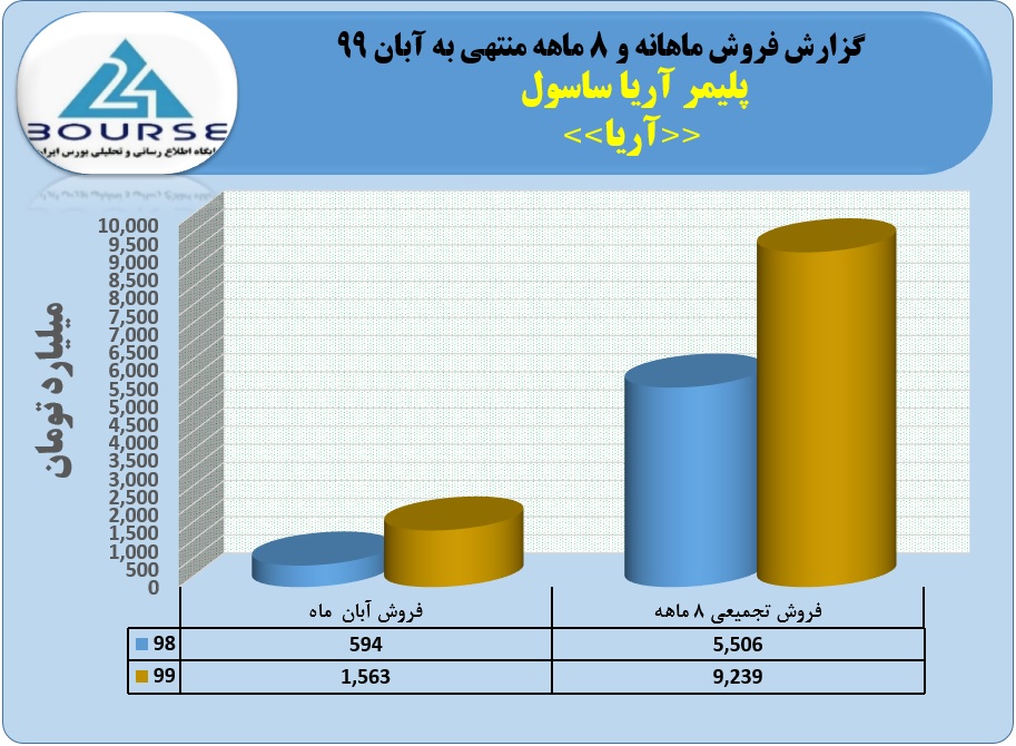 به گزارش کدال نگر بورس ٢۴ ، شرکت پلیمر آریا ساسول در ٨ ماهه منتهی به آبان ١٣٩٩ از فروش محصولات خود ٩٢٣٩ میلیارد تومان درآمد کسب نمود ،که از این مبلغ ١۵۶٣ میلیارد تومان آن مربوط به همین ماه می باشد. گفتنی است مبلغ فروش این شرکت در مدت ٨ ماهه سال ٩٩ در مقایسه با مدت مشابه سال قبل ۶٨ درصد رشد داشته است.