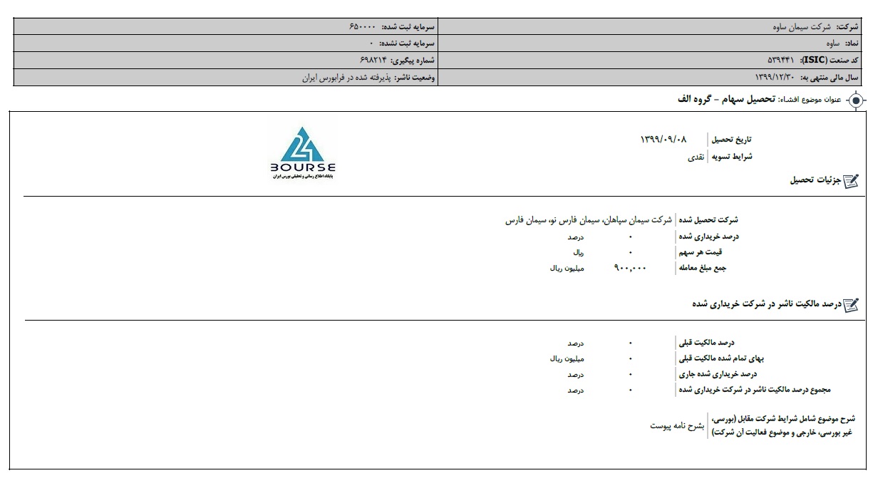 به گزارش کدال نگر بورس ٢۴، شرکت سیمان ساوه از خرید سهام شرکت سیمان سپاهان، سیمان فارس نو، سیمان فارس خبر داد.