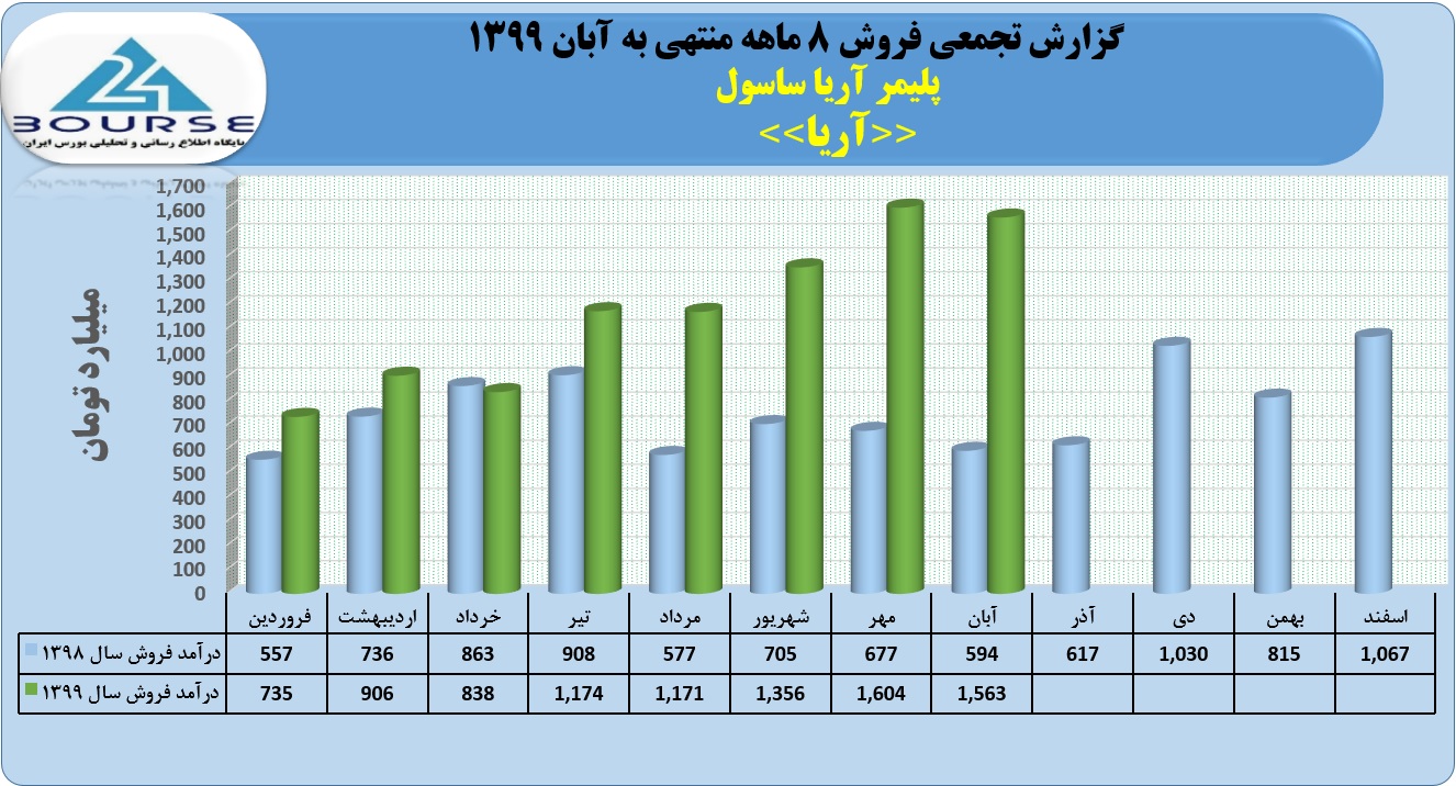 به گزارش کدال نگر بورس ٢۴، شرکت پلیمر آریا ساسول در ٨ ماهه منتهی به آبان ١٣٩٩ حدود ٩٢٣٩ میلیارد تومان از فروش محصولات خود درآمد کسب نمود، که ١۵۶٣ میلیارد تومان متعلق به ماه آبان می باشد.