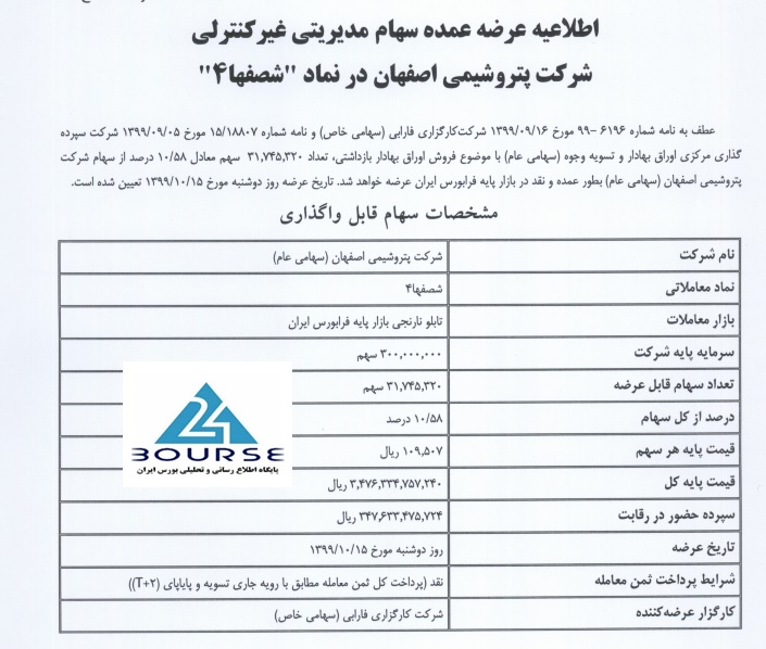 به گزارش بورس ٢۴، بلوک سهام مدیریتی غیر کنترلی شرکت پتروشیمی اصفهان در تاریخ ١۵ دی ماه ١٣٩٩ به قیمت پایه هر سهم ١٠٩،۵٠٧ ریال عرضه می شود. تعداد سهام قابل عرضه ٣١،٧۴۵،٣٢٠ سهم معادل ١٠.۵٨ درصد می باشد.