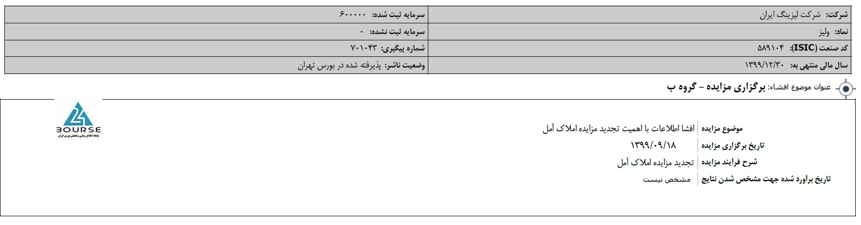 به گزراش کدال نگر بورس ٢۴، شرکت لیزینگ ایران اعلام نمود زمان مزایده املاک آمل را تجدید کرده است.