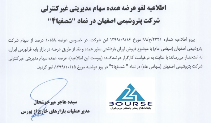 به گزارش بورس ٢۴،عرضه عمده ١٠/۵٨ درصد سهام پتروشیمی اصفهان در روز ١۵دی ماه لغو شد.