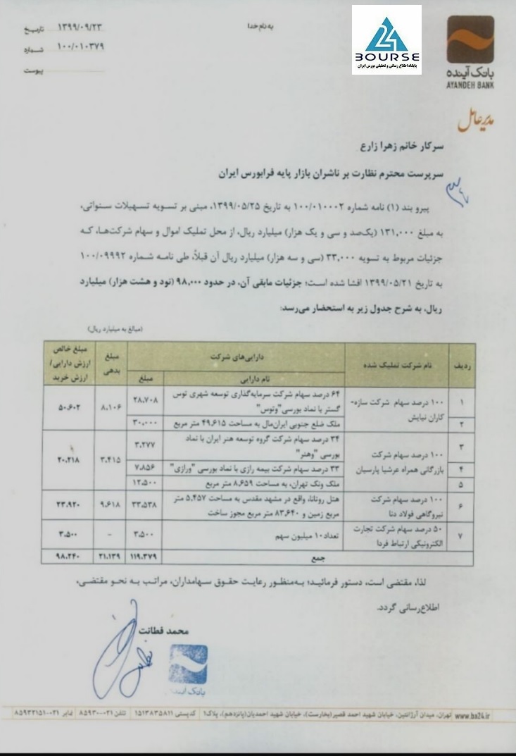 به گزارش کدال نگر بورس24 ، بانک آینده از تسویه تسهیلات از محل تملیک اموال و سهام شرکت ها خبر داد. 1. تملیک 100 درصد سهام شرکت سازه کاران نیایش (سهامی خاص)، مالک 64 درصد سهام شرکت سرمایه گذاری توسعه شهری توس گستر (نماد وتوس، بازار اول (تابلوی فرعی) بورس) به مبلغ 28،708 میلیارد ریال و ملک ضلع جنوبی ایران مال (به مساحت 49،615 مترمربع) به مبلغ 30،000 میلیارد ریال که با در نظر گرفتن بدهی شرکت مذکور، این تملیک به خالص ارزش دارایی به میزان 50،602 میلیارد ریال انجام شده است. 2. تملیک 100 درصد سهام شرکت بازرگانی همراه عرشیا پارسیان (سهامی خاص)، مالک 34 درصد سهام شرکت گروه توسعه هنر ایران (نماد وهنر، بازار پایه زرد فرابورس) به مبلغ 3،277 میلیارد ریال، 33 درصد سهام شرکت بیمه رازی (نماد ورازی، بازار پایه زرد فرابورس) به مبلغ 7،856 میلیارد ریال و ملک ونک (به مساحت 8،659 مترمربع) به مبلغ 12،500 میلیارد ریال که با در نظر گرفتن بدهی شرکت مذکور، این تملیک به خالص ارزش دارایی به میزان 20،218 میلیارد ریال انجام شده است. 3. تملیک 100 درصد سهام شرکت نیروگاهی فولاد دنا (سهامی خاص)، مالک هتل روتانا (واقع در مشهد مقدس به مساحت 5،457 مترمربع زمین و 83،640 مترمربع بنا) به مبلغ 33،538 میلیارد ریال که با در نظر گرفتن بدهی شرکت مذکور، این تملیک به خالص ارزش دارایی به میزان 23،920 میلیارد ریال انجام شده است. 4. تملیک 50 درصد سهام شرکت تجارت الکترونیک ارتباط فردا (سهامی خاص)، به میزان 3،500 میلیارد ریال انجام شده است.