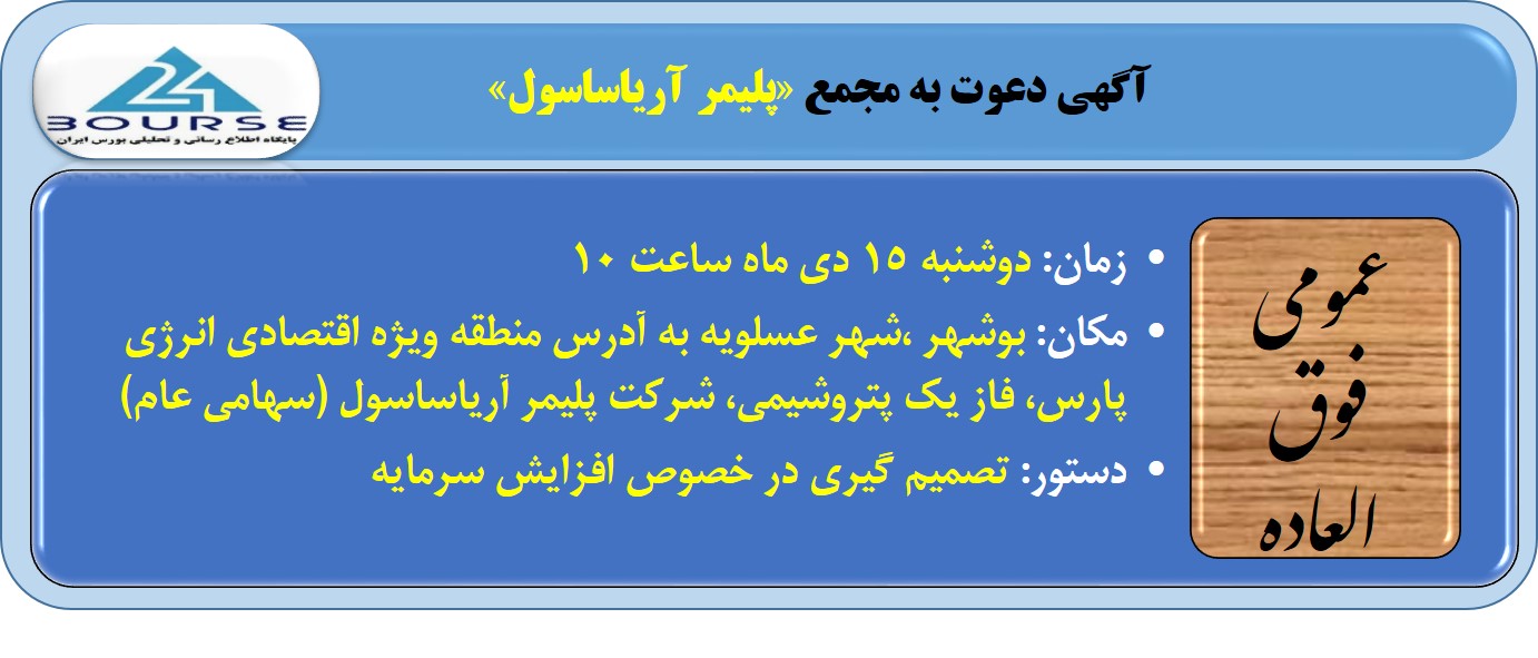 به گزارش کدال نگر بورس ٢۴، شرکت پلیمر آریا ساسول زمان تشکیل مجمع برای تصمیم گیری در خصوص افزایش سرمایه را اعلام نمود.