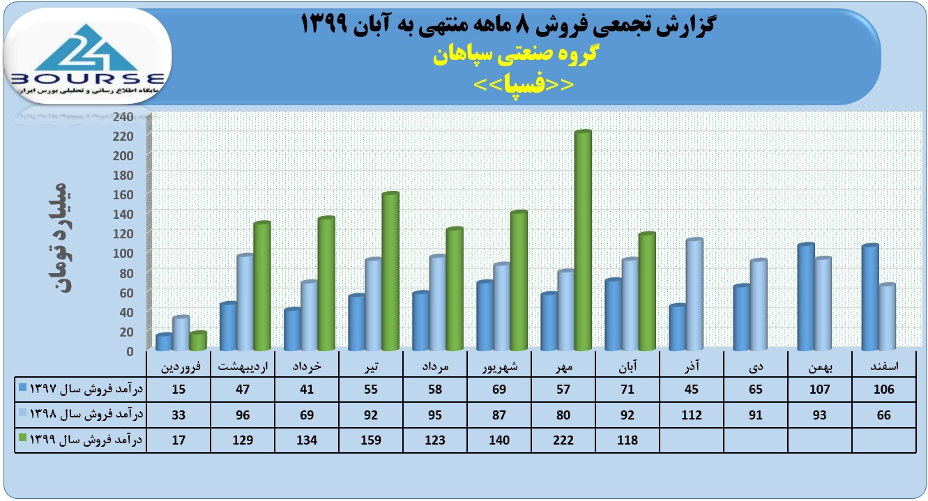 به گزارش کدال نگر بورس ٢۴، شرکت گروه صنعتی سپاهان در ٨ ماهه منتهی به آبان ١٣٩٩ حدود ١٠۴٢ میلیارد تومان فروش داشت که ١١٨ میلیارد تومان متعلق به آبان می باشد.