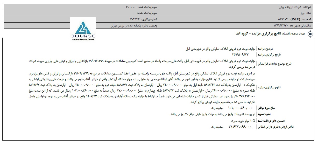 به گزارش کدال نگر بورس ٢۴، شرکت لیزینگ ایران از فروش املاک تملیکی واقع در شهرستان آمل خبر داد و اعلام نمود از این محل ٧.١ میلیارد تومان سود شناسایی کرده است.