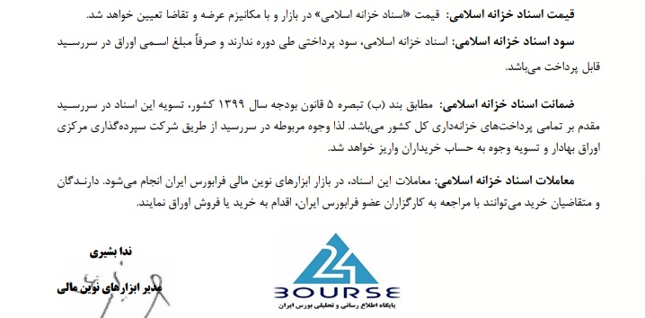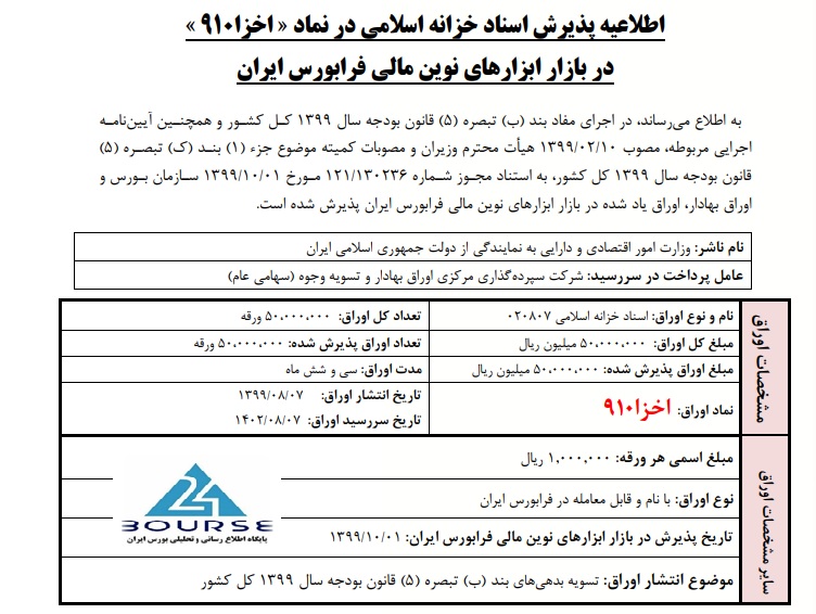 به گزارش بورس ٢۴، فرابورس ایران اسناد خزانه اسلامی در نماد «اخزا٩١٠» پذیرش می کند. تاریخ پذیرش در بازار ابزار های نوین مالی فرابورس ایران ١دی ماه می باشد.ارزش اسمی اسناد ١ میلیون ریال و تاریخ سررسید اسناد ٧ آبان ١۴٠٢ می باشد. قیمت اسناد بر اساس عرضه و تقاضا مشخص می شود.