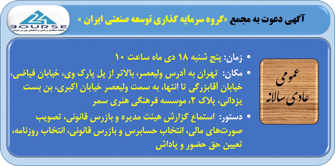 به گزارش کدال نگر بورس ٢۴، شرکت گروه سرمایه گذاری توسعه صنعتی ایران سهامداران خود را برای شرکت در مجمع عمومی عادی سالیانه فراخواند.