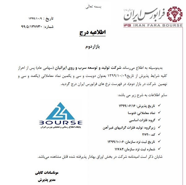 به گزارش بورس ٢۴، نماد شرکت تولید و توسعه سرب و روی ایرانیان در بازار دوم فرابورس ایران درج نماد شد.