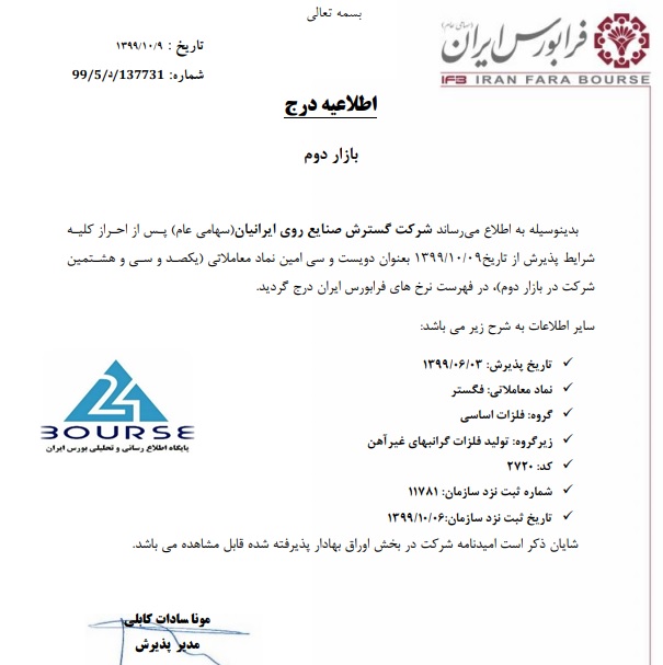 به گزارش بورس ٢۴، نماد شرکت گسترش صنایع روی ایرانیان در بازار دوم فرابورس ایران درج نماد شد.
