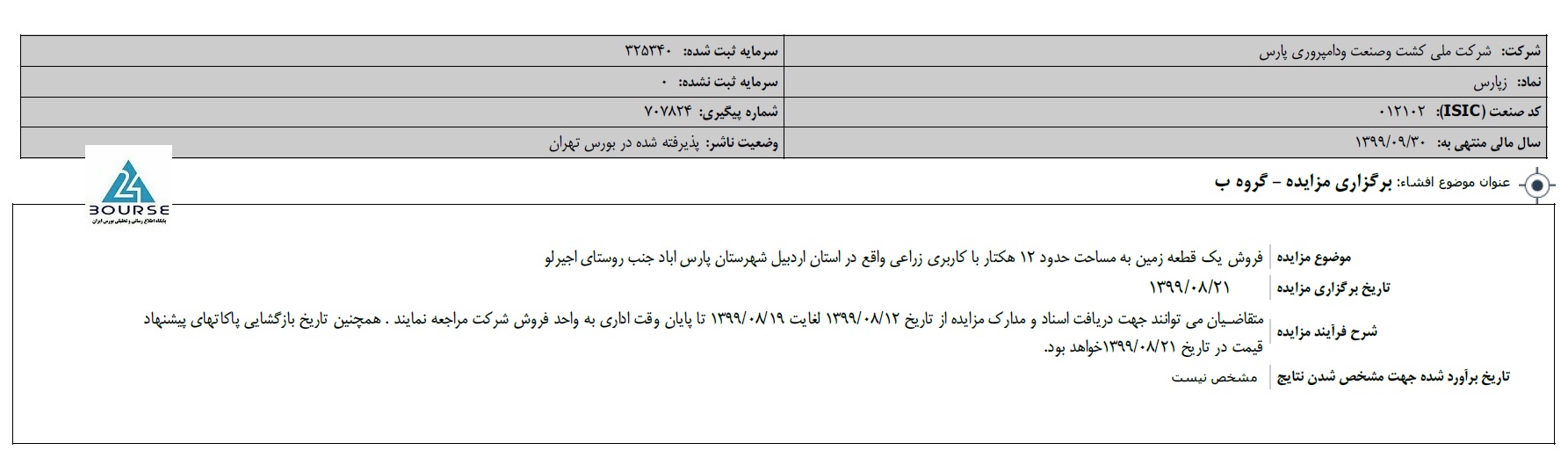 به گزارش کدال نگر بورس ٢۴، شرکت ملی کشت وصنعت ودامپروری پارس اعلام نمود یک قطعه زمین به مساحت حدود ١٢ هکتار با کاربری زراعی واقع در استان اردبیل شهرستان پارس اباد جنب روستای اجیرلو را از طریق مزایده به فروش می رساند.
