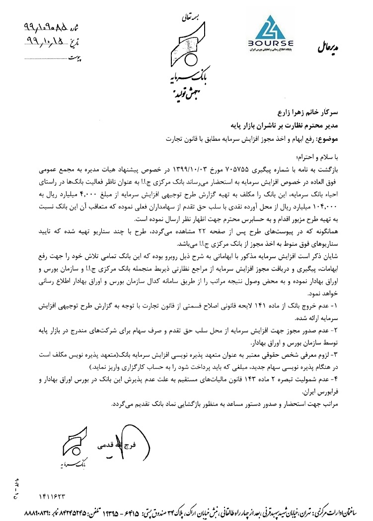 توضیحات بانک سرمایه در خصوص وضعیت افزایش سرمایه