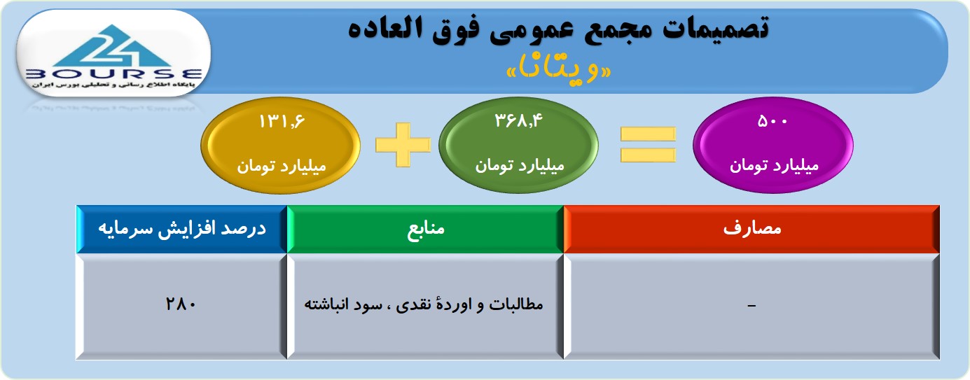 به گزارش کدال نگر بورس ٢۴، مجمع شرکت ویتانا با افزایش سرمایه ٢٨٠ درصدی شرکت از محل مطالبات و اوردۀ نقدی ، سود انباشته موافقت نمود.