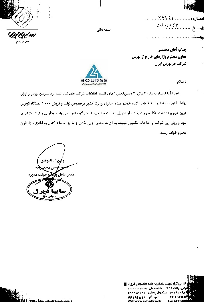 به گزارش کدال نگر بورس ٢۴، شرکت سایپا دیزل اعلام نمود با توجه به تفاهم نامه فیمابین گروه خودرو سازی سایپا و وزارت کشور درخصوص تولید و فروش ١.٠٠٠ دستگاه اتوبوس درون شهری (۵٠٠ دستگاه سهم شرکت سایپا دیزل) به استحضار میرساند هر گونه تغییر در روند سودآوری و اثرات مترتب بر سود و زیان این شرکت و اطلاعات تکمیلی مربوط به آن به محض نهایی شدن از طریق سامانه کدال به اطلاع سهامداران محترم خواهد رسید.
