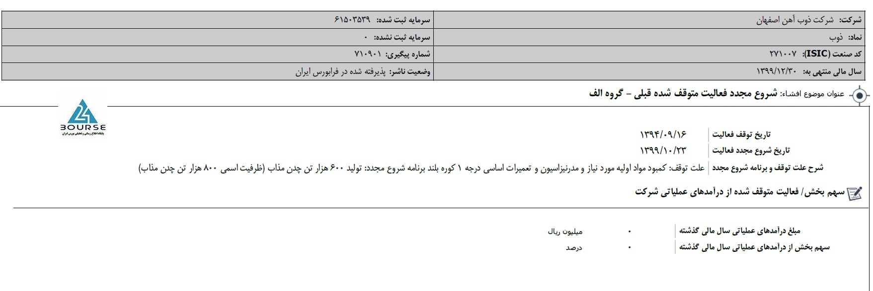 به گزارش کدال نگر بورس ٢۴، شرکت ذوب آهن از شروع مجدد فعابیت متوقف شده به علت کمبود مواد اولیه مورد نیاز و مدرنیزاسیون و تعمیرات اساسی درجه ١ کوره بلند خبر داد. برنامه شروع مجدد: تولید ۶٠٠ هزار تن چدن مذاب (ظرفیت اسمی ٨٠٠ هزار تن چدن مذاب) می باشد.