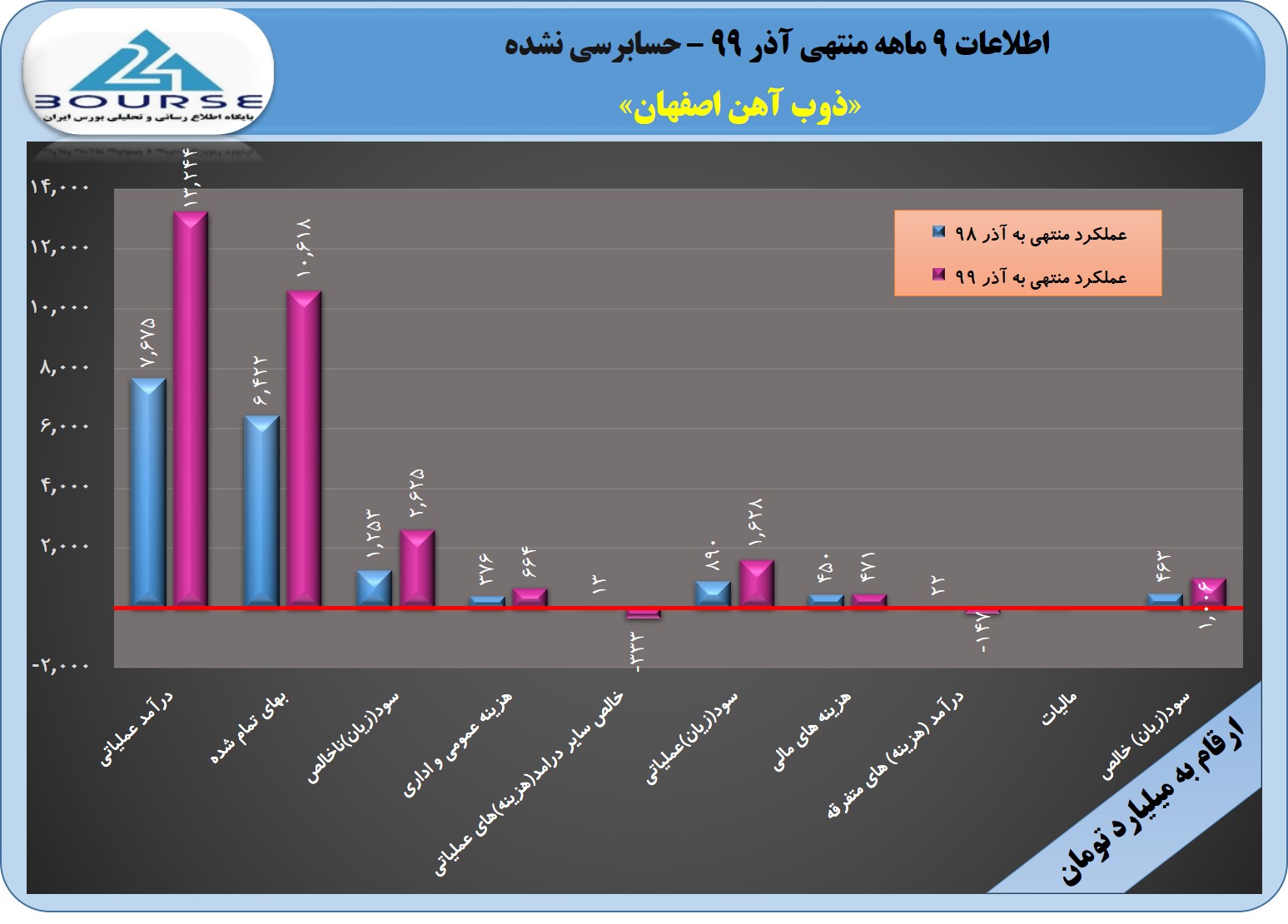 به گزارش کدال نگر بورس ٢۴ شرکت ذوب آهن اصفهان در ٩ ماهه منتهی به آذر ٩٩ برای هر سهم ١۶۴ ریال سود محقق کرد که به نسبت دوره قبل رشد ١١٨ درصدی داشته است. سود ناخالص در این دوره با ١١٠ درصد رشد به ٢۶٢۵ میلیارد تومان و سود خالص به ١٠٠۶ میلیارد تومان رسید. گفتنی است حاشیه سود خالص این شرکت در دوره یاد شده به ٨ درصد رسید.