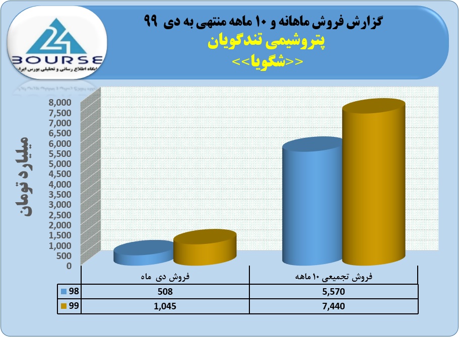 به گزارش کدال نگر بورس ٢۴ ، شرکت پتروشیمی تندگویان در ١٠ ماهه منتهی به دی ١٣٩٩ از فروش محصولات خود ٧۴۴٠ میلیارد تومان درآمد کسب نمود که از این مبلغ ١٠۴۵ میلیارد تومان آن مربوط به همین ماه می باشد. گفتنی است مبلغ فروش این شرکت در مدت ١٠ ماهه سال ٩٩ در مقایسه با مدت مشابه سال قبل ٣۴ درصد رشد داشته است.