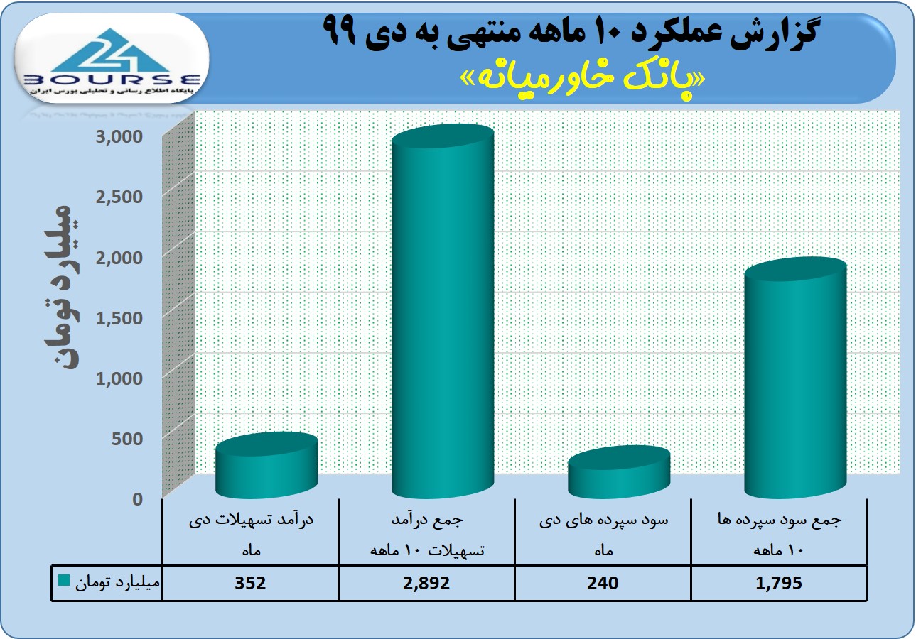به گزارش کدال نگر بورس ٢۴، بانک خاورمیانه در عملکرد ١٠ ماهه منتهی به دی ١٣٩٩، حدود ٢٨٩٢ میلیارد تومان درآمد از تسهیلات اعطایی خود کسب نمود. هم چنین جمع سود اعطا شده به سپرده های سرمایه گذاری شده در این بانک به ١٧٩۵میلیارد تومان رسید. گفتنی است تراز این بانک در این ماه ١١٢ میلیارد تومان و در کل دوره ١٠٩٧ میلیارد تومان مثبت بود.