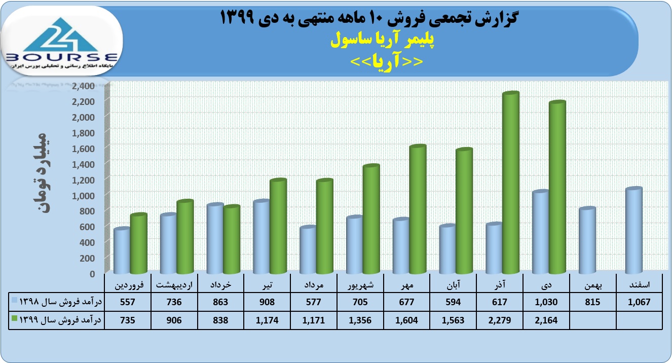 به گزارش کدال نگر بورس ٢۴، مجموع درآمد فروش ١٠ ماهه منتهی به آذر ١٣٩٩ شرکت پلیمر آریا ساسول حدود ١٣۶١٧ میلیارد تومان می باشد که حدود ٢١۶۴ میلیارد تومان از این مبلغ متعلق به دی می باشد.