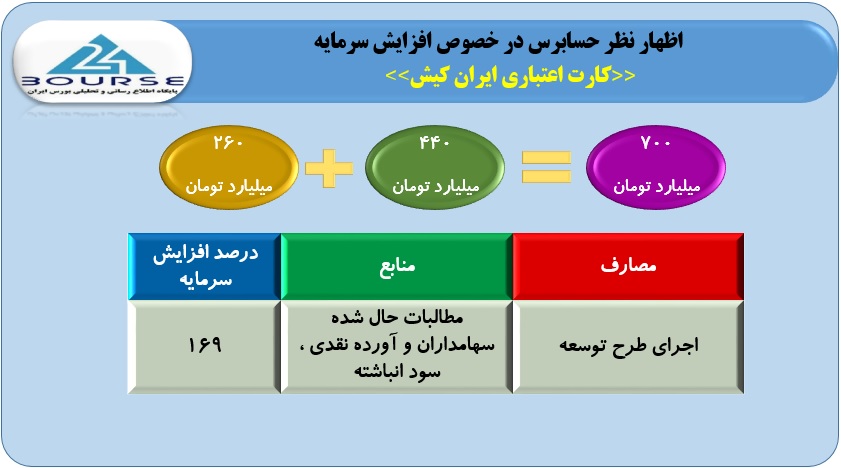 به گزارش کدال نگر بورس ٢۴، حسابرس افزایش سرمایه ١۶٩ درصدی کارت اعتباری ایران کیش از محل مطالبات حال شده سهامداران و آورده نقدی، سود انباشته را تایید نمود.