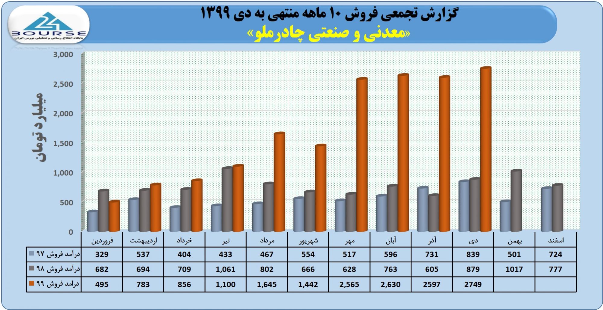 به گزارش کدال نگر بورس ٢۴، درآمد فروش شرکت چادرملو در ١٠ ماهه منتهی به دی سال ١٣٩٩ به ١٨٣٨٨ میلیارد تومان رسید که در مقایسه با مدت مشابه سال قبل ١٣۴ درصد رشد داشته است.