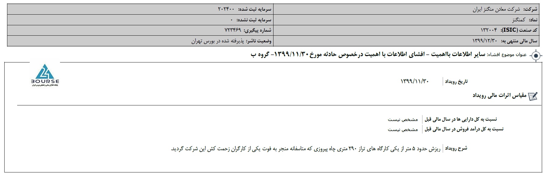 به گزارش کدال نگر بورس ٢۴، شرکت معادن منگنز ایران اعلام نمود ریزش حدود ۵ متر از یکی کارگاه های تراز ٢٩٠ متری چاه پیروزی متاسفانه منجر به فوت یکی از کارگران زحمت کش این شرکت گردید.