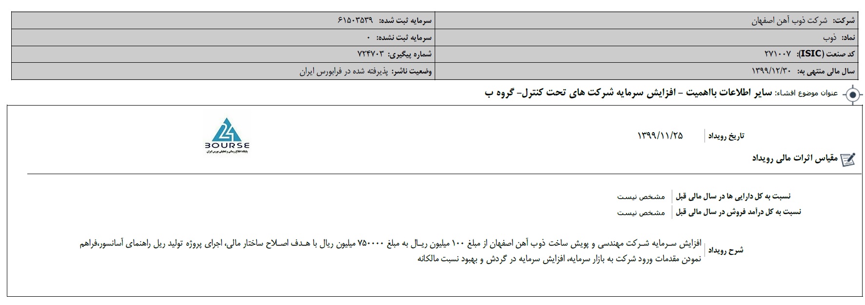 به گزارش کدال نگر بورس ٢۴، شرکت ذوب آهن اصفهان از افزایش سرمایه شرکت مهندسی و پویش ساخت ذوب آهن اصفهان از مبلغ ١٠٠ میلیون ریال به مبلغ ٧۵٠٠٠٠ میلیون ریال با هدف اصلاح ساختار مالی، اجرای پروژه تولید ریل راهنمای آسانسور،فراهم نمودن مقدمات ورود شرکت به بازار سرمایه، افزایش سرمایه در گردش و بهبود نسبت مالکانه خبر داد.
