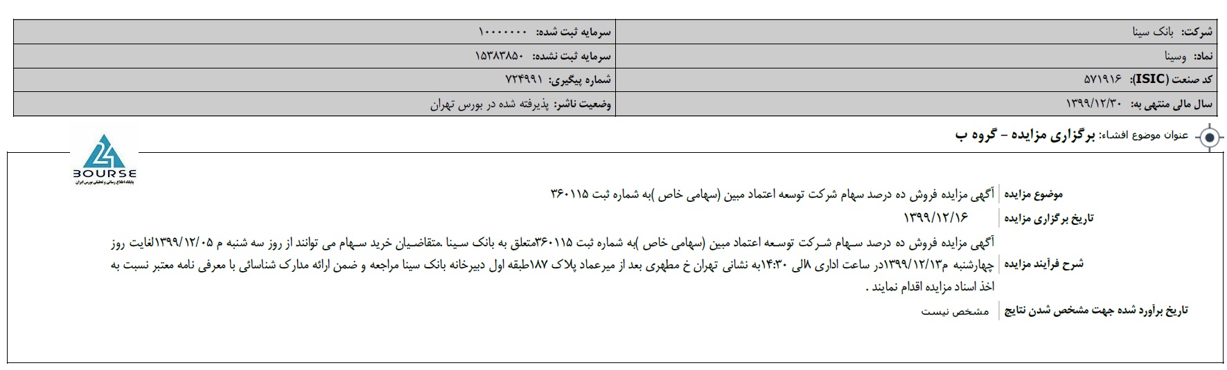 به گزارش کدال نگر بورس ٢۴، بانک سینا اعلام نمود ده درصد سهام شرکت توسعه اعتماد مبین (سهامی خاص )به شماره ثبت ٣۶٠١١۵متعلق به بانک را از طریق مزایده به فروش می رساند.