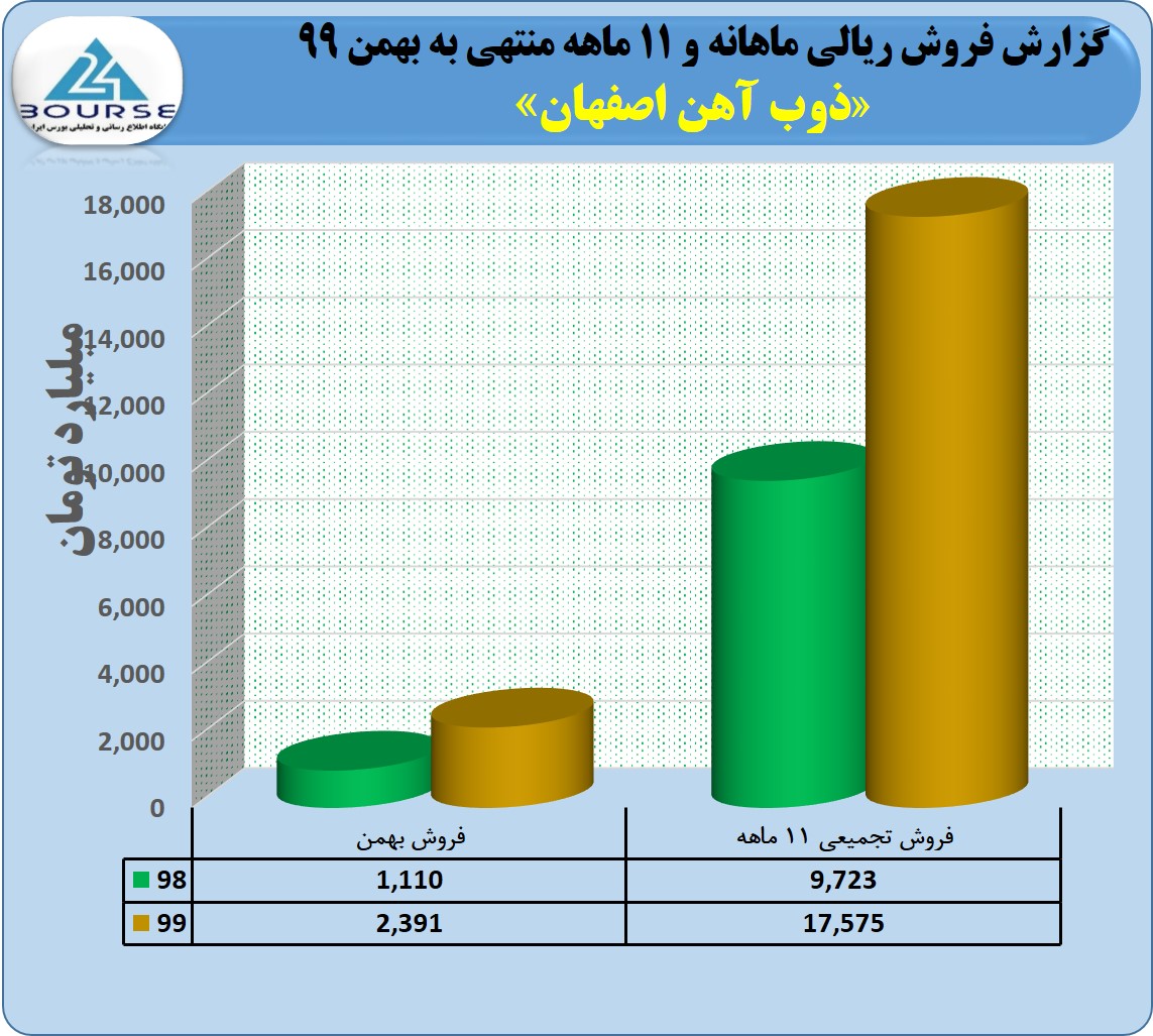 به گزارش کدال نگر بورس ٢۴ ، شرکت ذوب اهن اصفهان در ١١ ماهه منتهی به بهمن سال جاری از فروش محصولات خود ١٧۵٧۵ میلیارد تومان درآمد کسب نمود که از این مبلغ ٢٣٩١ میلیارد تومان آن مربوط به همین ماه می باشد. گفتنی است مبلغ فروش این شرکت در مدت ١١ ماهه در مقایسه با مدت مشابه سال قبل ٨١ درصد رشد داشته است.