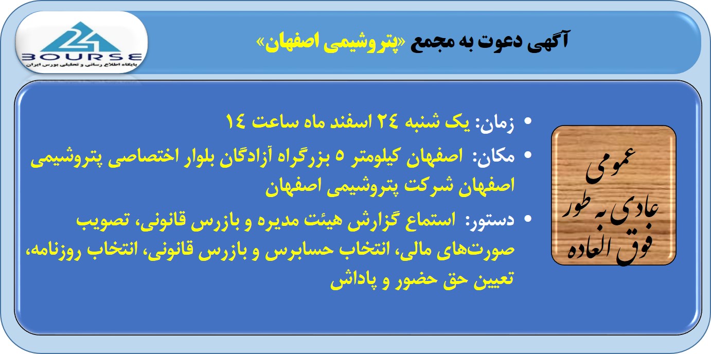 به گزارش کدال نگر بورس ٢۴، شرکت پتروشیمی اصفهان سهامداران خود را برای شرکت در مجمع عمومی عادی به طور فوق العاده فراخواند.