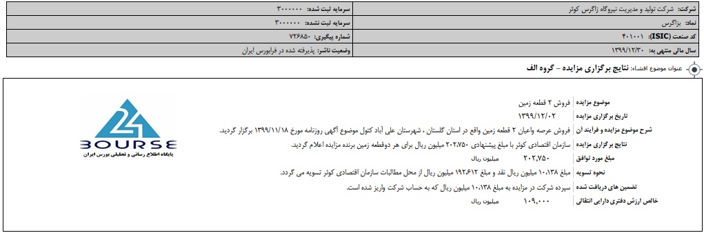 به گزارش کدال نگر بورس ٢۴، شرکت تولید و مدیریت نیروگاه زاگرس کوثر دو قطعه زمین را از طریق مزایده به مبلغ حدود ٢٠ میلیارد تومان و به ارزش دفتری حدود ١١ میلیارد تومان به فروش رساند.