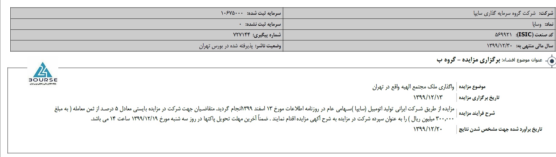به گزارش کدال نگر بورس ٢۴، شرکت گروه سرمایه گذاری سایپا اعلام نمود ملک مجتمع الهیه واقع در تهران را از طریق مزایده واگذار می کند.