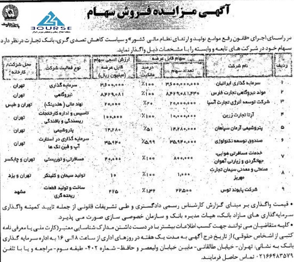 به گزارش کدال نگر بورس ٢۴، بانک تجارت اعلام داشت ، مزایده واگذاری شرکتهای جدول پیوست طبق آگهیهای منتشره در روزنامههای دنیای اقتصاد و جهان صنعت به ترتیب به شمارههای ۵٠٨٨ و ۴۶۴٨ در تاریخ ٣٠/١٠/١٣٩٩ برگزار گردید اما منتج به فروش نگردیده است.