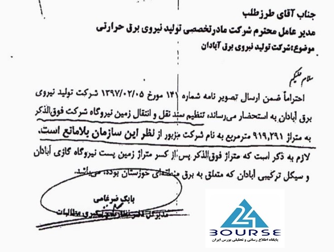 به گزارش کدال نگر بورس ٢۴، تولید نیروی برق آبادان اعلام داشت، ازگشت به نامه واصله از شرکت بورس اوراق بهادار تهران مبنی بر لزوم رعایت ماده ٢ مکرر ٣ دستورالعمل اجرایی افشای اطلاعات شرکت های ثبت شده نزد سازمان (پیوست ١) به استحضار می رساند ١) بر اساس گزارش ارزیابی مورخ ٣٠/٠٧/١٣٩٢ که مبنای محاسبه قیمت پایه سهام آن شرکت میباشد، عرصه کل نیروگاه به مساحت ٩١٩.٢٩١ متر مربع توسط کارشناسان رسمی دادگستری منتخب سازمان خصوصی سازی، قیمت گذاری و در مبلغ قرارداد خرید سهام شرکت تولید نیروی برق آبادان به شماره ٣٨٨١/۴٣ مورخ ٢۴/٠٢/١٣٩٣ لحاظ شده و در صفحه ١٣ گزارش مذکور نیز قید گردیده که عرصه ملک در حال نقل و انتقال رسمی در دفترخانه اسناد رسمی شماره ٣۴ آبادان به نام سازمان توسعه برق ایران می باشد (پیوست ١). ٢) خریداران پس از انعقاد قرارداد واگذاری و به منظور الحاق نیروگاه آبادان به منطقه آزاد اروند و بهره مندی از مزایای منطقه آزاد، اقدامات و پیگیریهای لازم را جهت صدور و انتقال سند مالکیت زمین نیروگاه آبادان از مراجع ذیربط به عمل آوردند که در این راستا موافقت سازمان خصوصی سازی و وزارت نیرو مبنی بر بلامانع بودن صدور و انتقال سند مالکیت زمین نیروگاه به نام مالک (شرکت تولید نیروی برق آبادان) اخذ گردید. (پیوستهای ٢ و ٣). ٣) پس از مکاتبات متعدد و مذاکرات صورت گرفته در سالیان اخیر با مسئولان سازمان حفاظت محیط زیست، سازمان مذکور بر اساس نامه شماره ۴۵٩٣/٩٩ مورخ ٢٠/٠٢/١٣٩٩ (پیوست ۴) مکلف به طرح موضوع در جلسه شورای عالی حفاظت محیط زیست گردیده، لیکن از آنجاییکه جلسات شورای مذکور عموماً به صورت سالیانه برگزار میگردد و نیز تراکم موضوعاتی که در دستور جلسه شورا قرار دارند، تاکنون فرصت طرح موضوع در جلسه شورای مذکور فراهم نشده که با عنایت به پیگیریها و هماهنگیهای صورت گرفته، مقرر شده در جلسات بعدی شورا مطرح گردد.