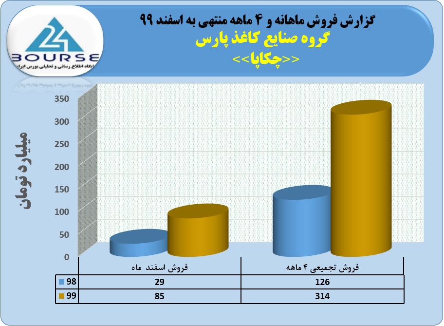 به گزارش کدال نگر بورس ٢۴ ، شرکت گروه صنایع کاغذ پارس در ۴ ماهه نخست از سال مالی ١۴٠٠ منتهی به اسفند سال ١٣٩٩ از فروش محصولات خود ٣١۴ میلیارد تومان درآمد کسب نمود که از این مبلغ ٨۵ میلیارد تومان آن مربوط به همین ماه می باشد. گفتنی است مبلغ فروش این شرکت در مدت ۴ ماهه در مقایسه با مدت مشابه سال قبل ١۴٨ درصد رشد داشته است.فروش اسفند بیشترین مبلغ فروش ماهانه در سال مالی جاری است.