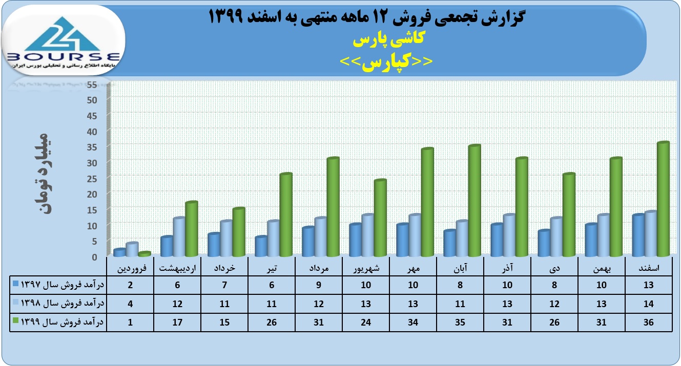 به گزارش کدال نگر بورس ٢۴ ، شرکت کاشی پارس در ١٢ ماهه منتهی به اسفند سال ١٣٩٩ از فروش محصولات خود حدود ٣٠٢ میلیارد تومان درآمد کسب نمود ، که از این مبلغ ٣۶ میلیارد تومان آن مربوط به همین ماه می باشد. گفتنی است فروش دوره مشابه سال قبل ١٣۶ میلیارد تومان بود.