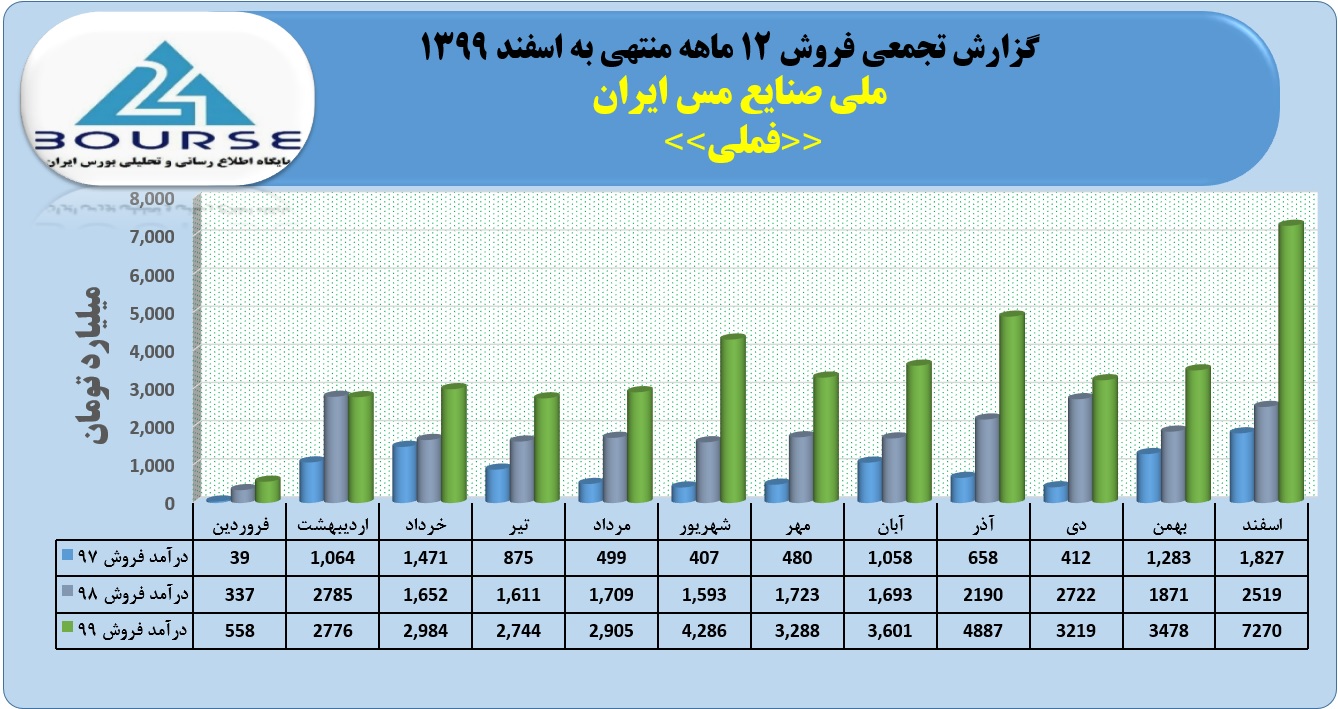 به گزارش کدال نگر بورس ٢۴، مجموع درآمد فروش ١٢ ماهه منتهی به اسفند ١٣٩٩ شرکت ملی صنایع مس ایران حدود ۴١٩۴٠ میلیارد تومان می باشد که حدود ٧٢٧٠ میلیارد تومان از این مبلغ متعلق به اسفند می باشد.