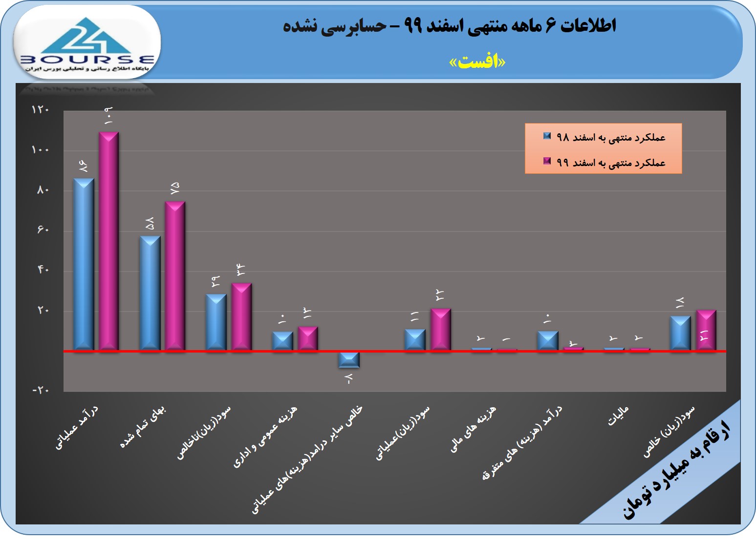 به گزارش کدال نگر بورس ٢۴ شرکت افست در ۶ ماهه منتهی به اسفند ٩٩ برای هر سهم ٢١١ ریال سود محقق کرد که به نسبت دوره قبل رشد ١٨ درصدی داشته است. سود ناخالص در این دوره با ٢٠ درصد رشد به ٣۴ میلیارد تومان رسید.