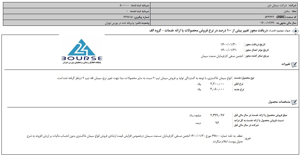 به گزارش کدال نگر بورس24 ،شرکت سیمان خزر نرخ انواع سیمان خاکستری را از 2،200،000 ریال به 3،080،000 افزایش داد..jpg)