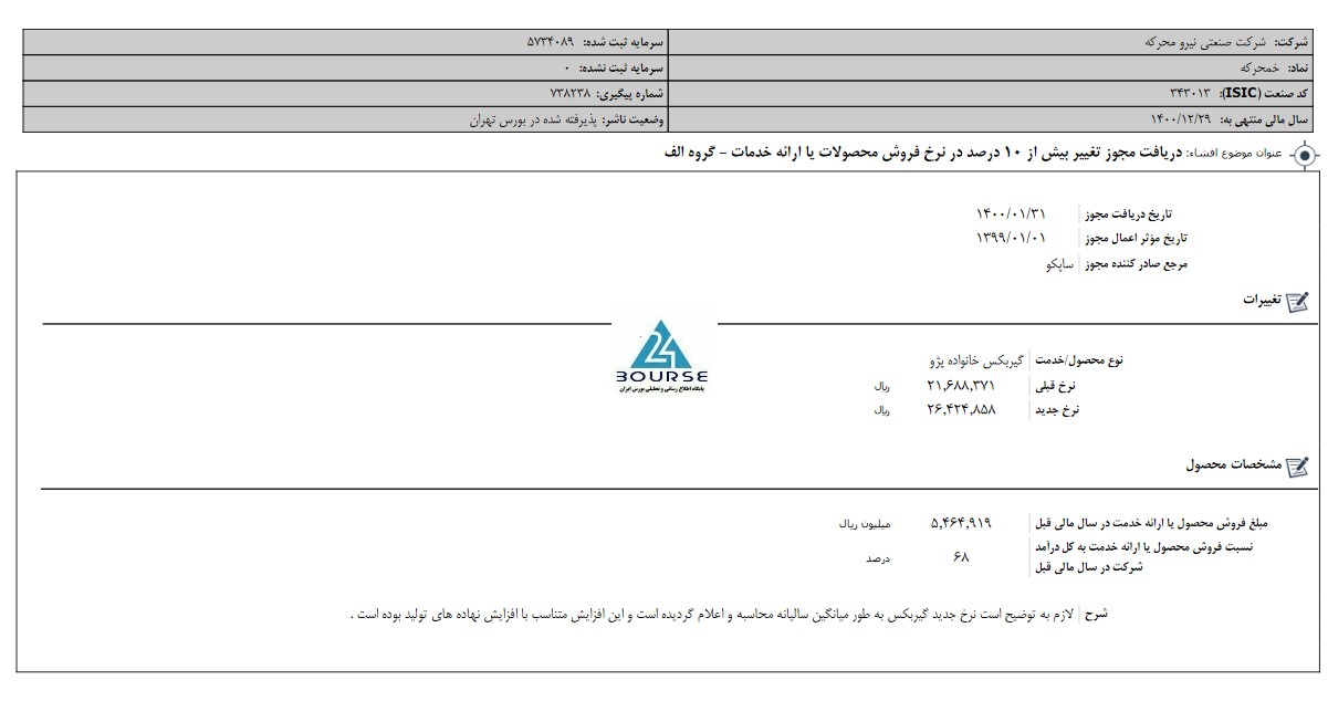 به گزارش کدال نگر بورس ٢۴، شرکت صنعتی نیرو محرکه اعلام نمود نرخ گیربکس خانواده پژو افزایش یافته است و نرخ جدید گیربکس به طور میانگین سالیانه محاسبه و اعلام گردیده است و این افزایش متناسب با افزایش نهاده های تولید بوده است .