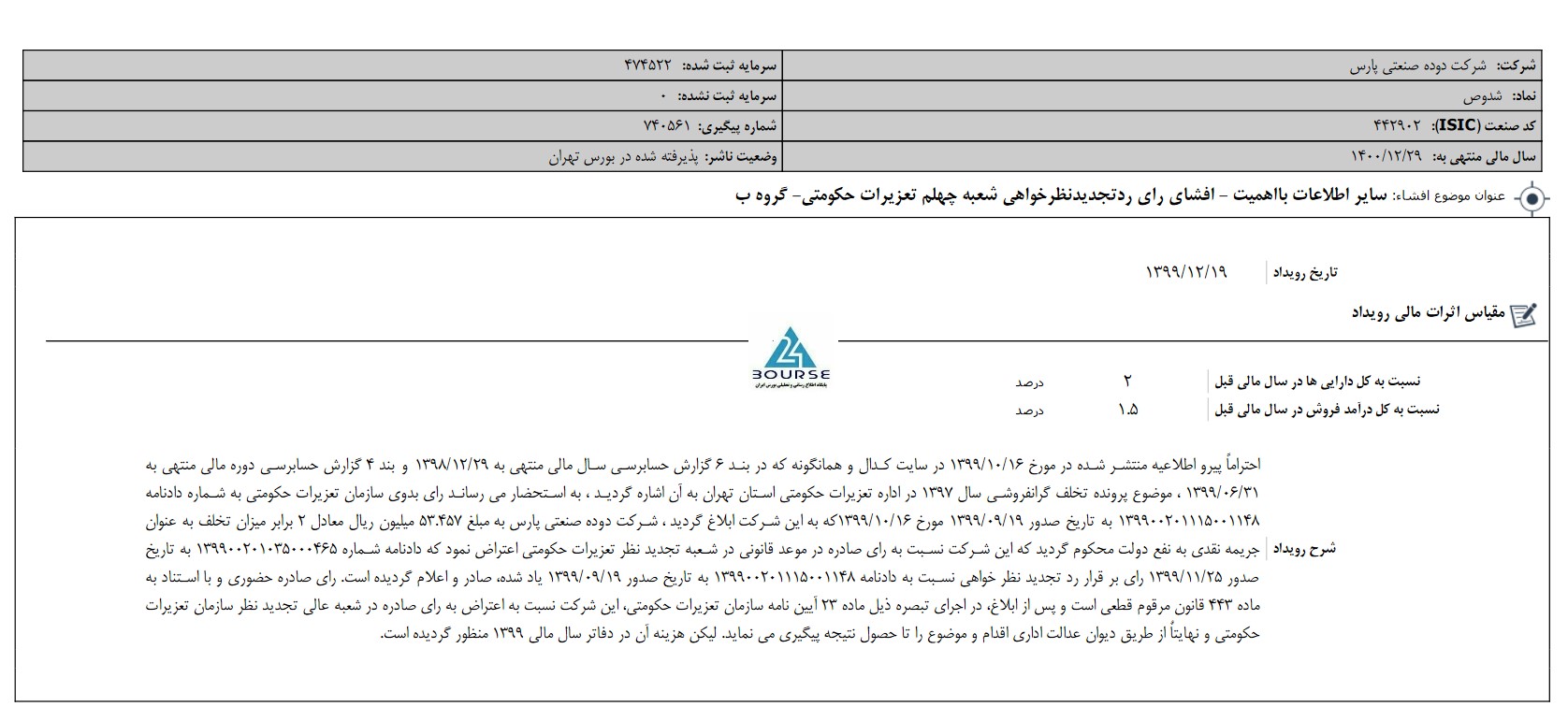 به گزارش کدال نگر بورس24 ، شرکت دوده صنعتی پارس در خصوص رای ردتجدیدنظرخواهی شعبه چهلم تعزیرات حکومتی شفاف سازی نمود.