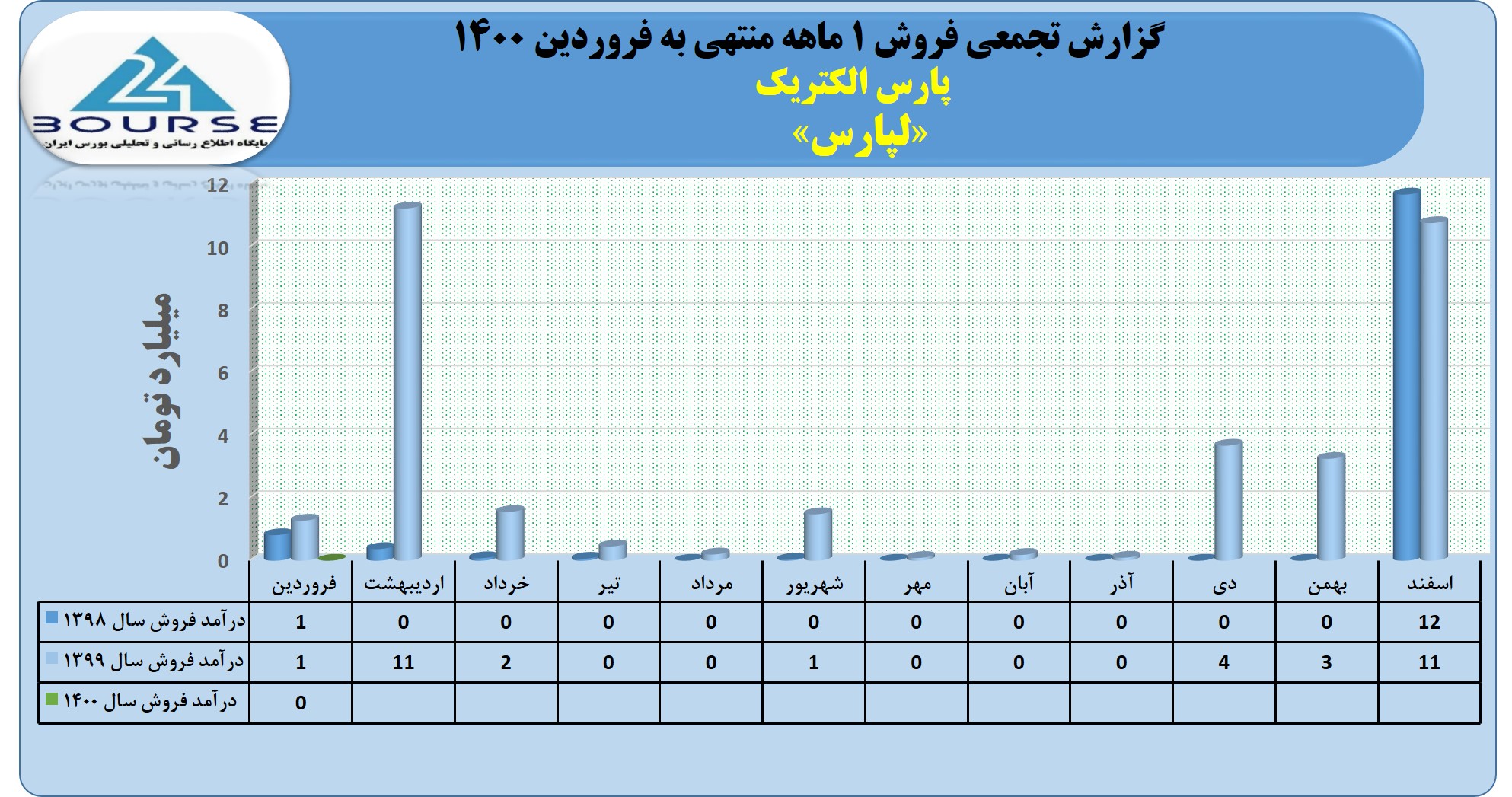 به گزارش کدال نگر بورس ٢۴، شرکت پارس الکتریک در مدت ١ ماهه منتهی به فروردین ١۴٠٠ حدود ٠.۴ میلیارد تومان درآمد از فروش محصولات خود به دست آورد.