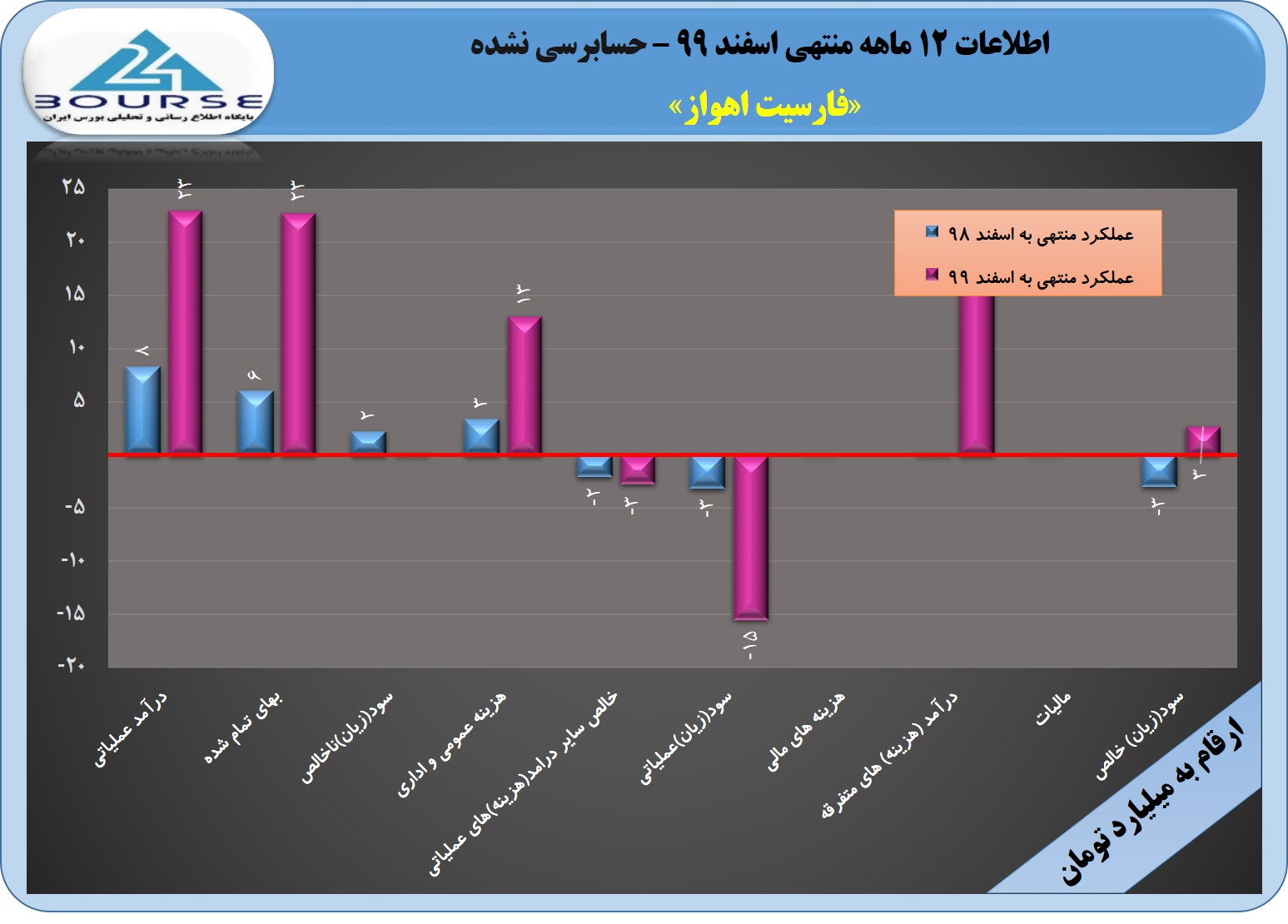 به گزارش کدال نگر بورس24 ، شرکت فارسیت اهواز در 12 ماهه منتهی به اسفند 99 برای هر سهم 41 ریال سود محقق کرد در حالی که در دوره قبل 45 ریال زیان شناسایی کرده بود.